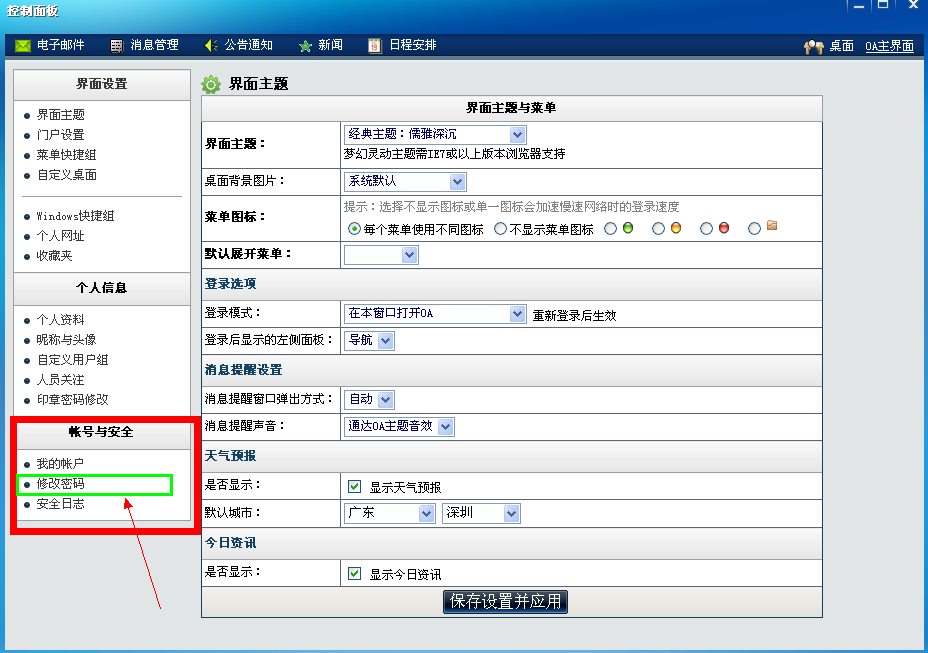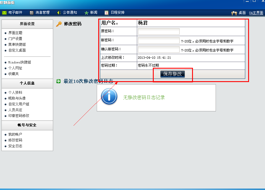(4)OA地址(內(nèi)網(wǎng))修改成下面內(nèi)容[changanwuye.gicp.net:800]。用戶名首次登陸為自己的名字,沒有密碼。點擊保存。就可以直接登錄了。
