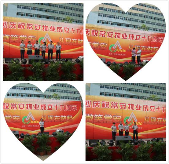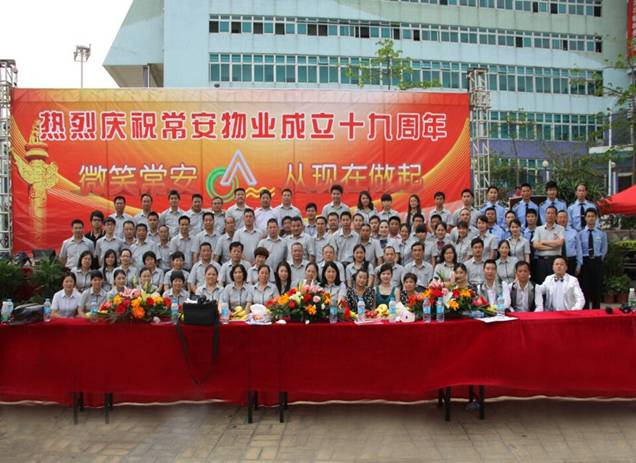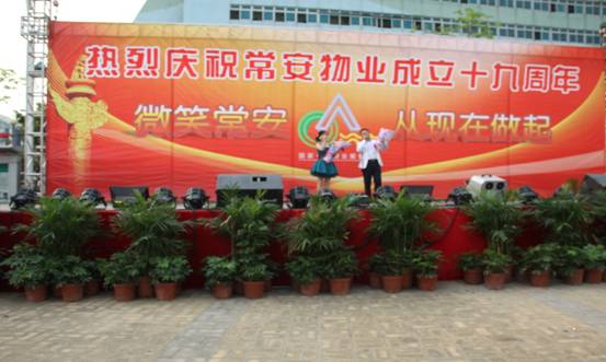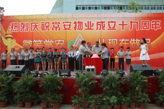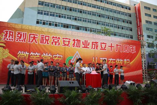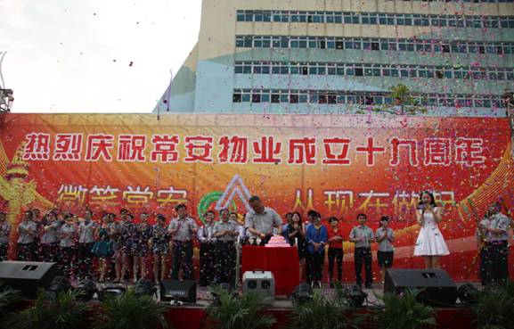 常安物業(yè)十九周年慶典于2014年4月19日下午在百旺信園區(qū)廣場成功舉辦,來自各服務中心的一百多位同事齊聚現(xiàn)場,共同慶祝常安十九周歲生日!現(xiàn)場活動十分精彩,有充滿活力的舞蹈、情感真摯的詩歌朗誦,還有優(yōu)美動聽的情歌對唱,此外還加入了以“微笑常安”為主題的征文朗誦和頒獎典禮?;仡櫝0彩拍陙淼膴^斗史,我們常安人榮辱與共,迎來輝煌的今天;今天我們攜手共進,展望未來,明日再攀成功的高峰。讓我們共同舉杯,祝愿我們常安的明天會更好。
