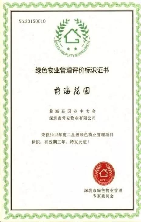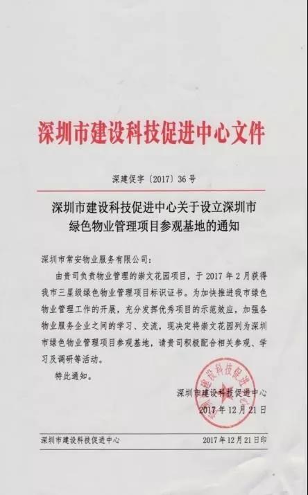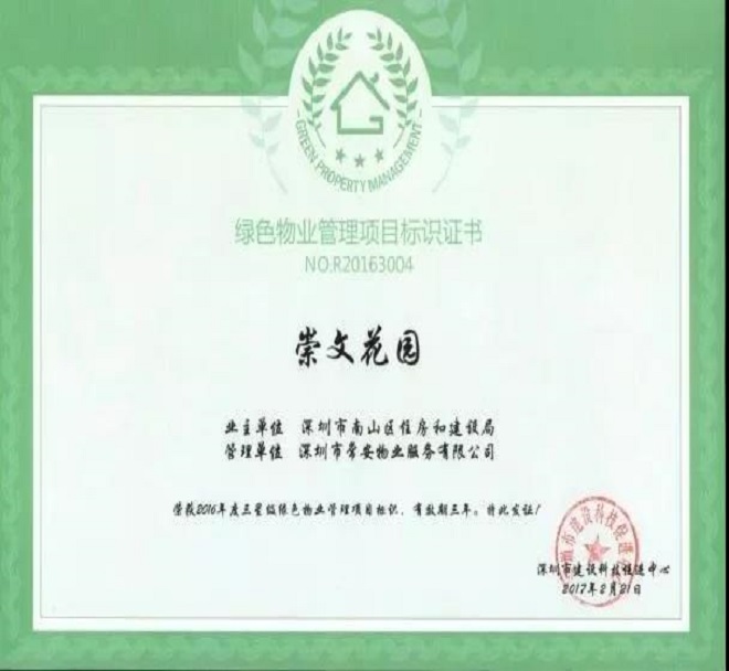 依據(jù)2011 年深圳出臺的首部《深圳市綠色物業(yè)管理導則(試行)》和 2013 年出臺的《深圳市綠色物業(yè)管理項目評價辦法和細則(試行)》,常安物業(yè)積極響應并開展綠色物業(yè)管理工作,2016 年至今,共有四個項目榮獲了深圳市政府部門頒發(fā)的綠色物業(yè)管理項目證書,其中崇文花園還被深圳市政府部門列為深圳市綠色物業(yè)管理項目參觀基地,2019年出任廣東省綠色供應鏈協(xié)會綠色物業(yè)管理專業(yè)委員會副主任委員單位。色物業(yè)管理